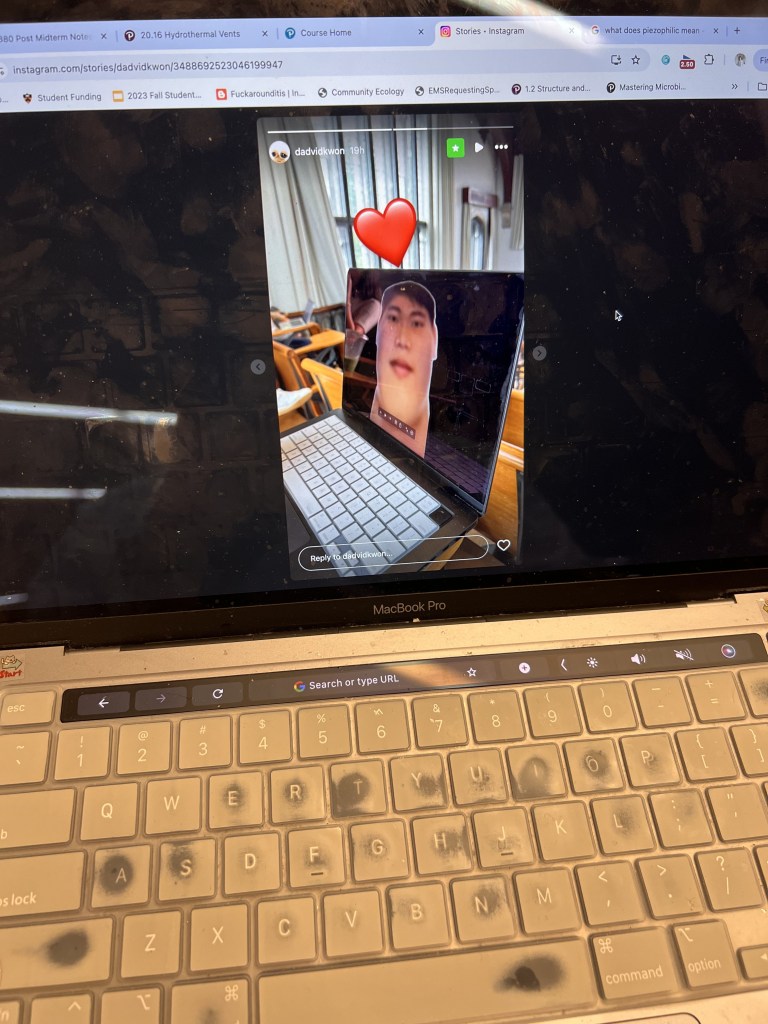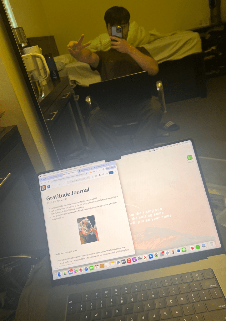 - Was a really productive day today: finished your chem PSET, bio PSET, Chem Pre-lab, Bio Lab Entry, and Korean Homework. Also went to 4 classes, got lunch/dinner/2 late meals, and went to the gym and did leg day